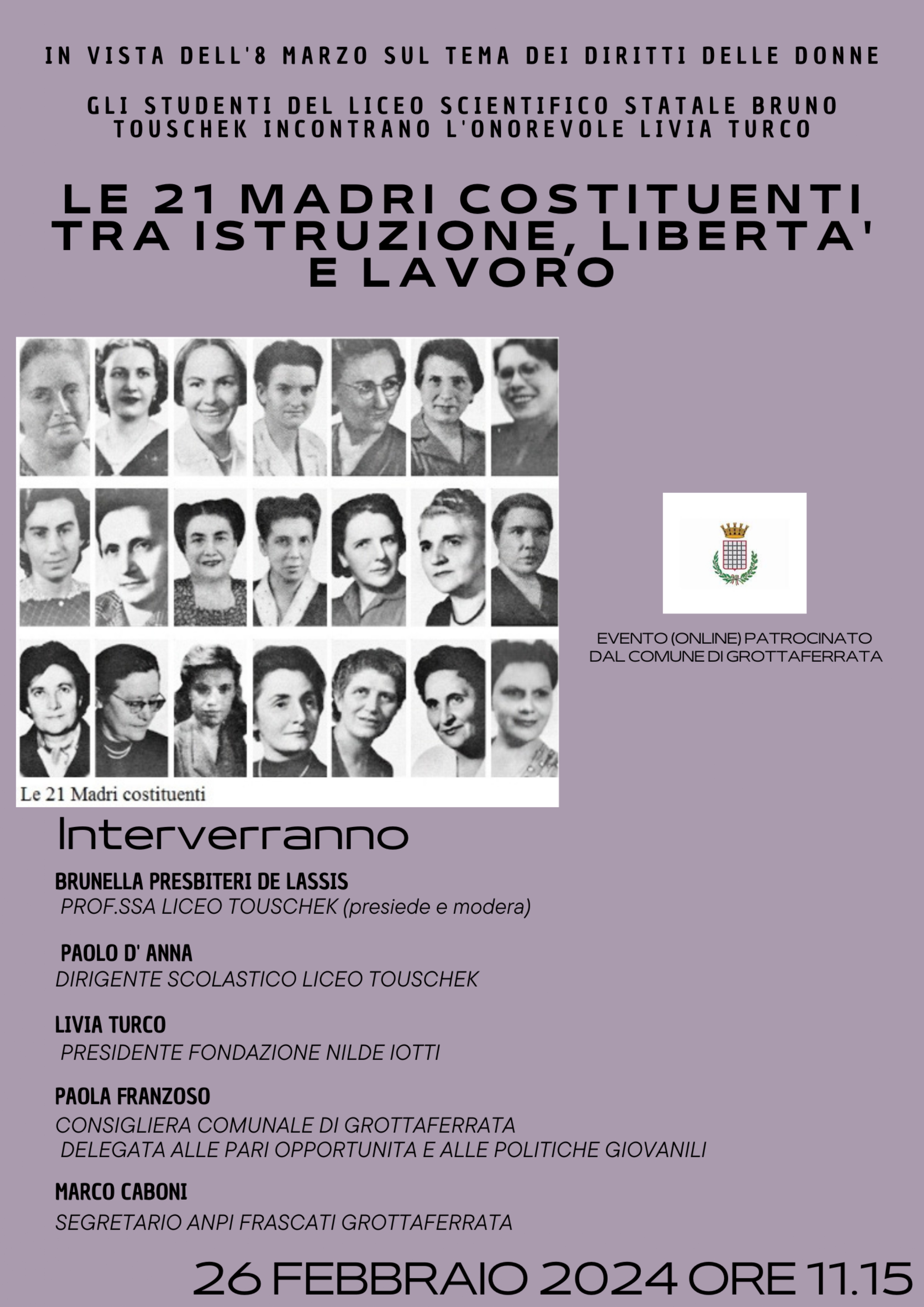 Lunedì 26 febbraio, dalle ore 11,15 alle 13,15, si svolgerà l’incontro con l’On Livia Turco, su “LE 21 MADRI COSTITUENTI, TRA ISTRUZIONE, LIBERTA’ E LAVORO”.